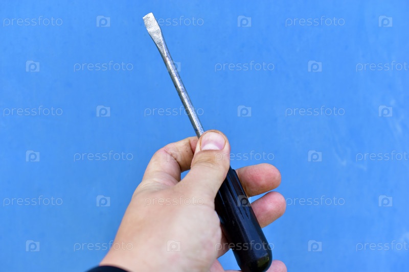 Черная отвертка в руке на синем фоне