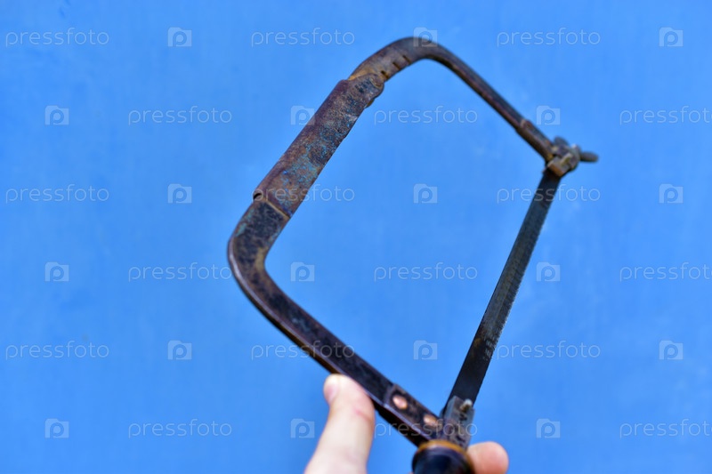 Металлическая ножовка в руке на синем фоне