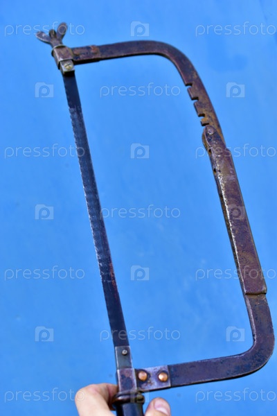 Металлическая ножовка в руке на синем фоне