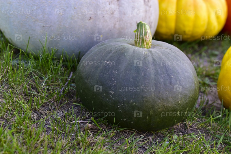 Сине-желтая и красная тыква на фоне травы
