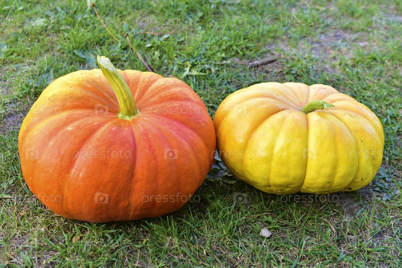 Желтая и красная тыква на фоне травы осенью
