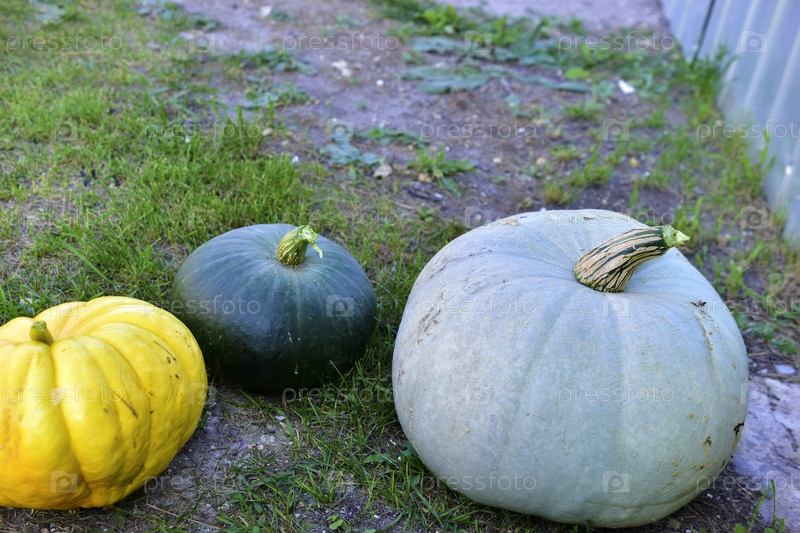 Сине-желтая и красная тыква на фоне травы
