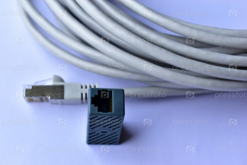 Патч-корд кабеля LAN белый шнур на белом фоне с адаптером