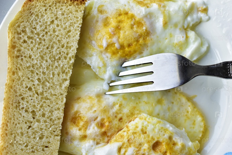 Три яичницы на тарелке с хлебом и вилкой