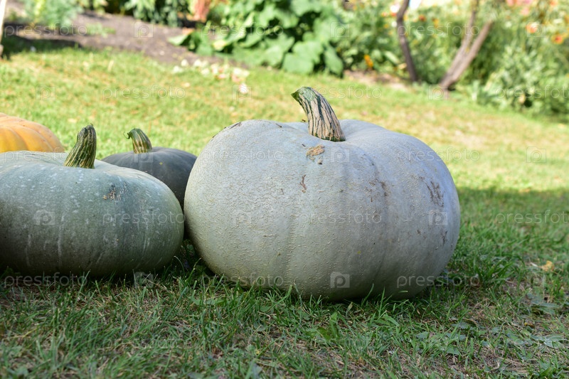 Сине-желтая и красная тыква на фоне травы