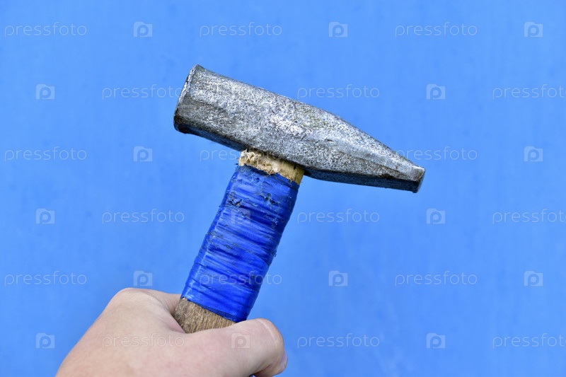 Железный молот в руке на синем фоне