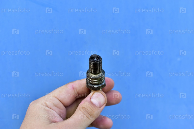 Грязная автомобильная свеча зажигания в руке на синем фоне