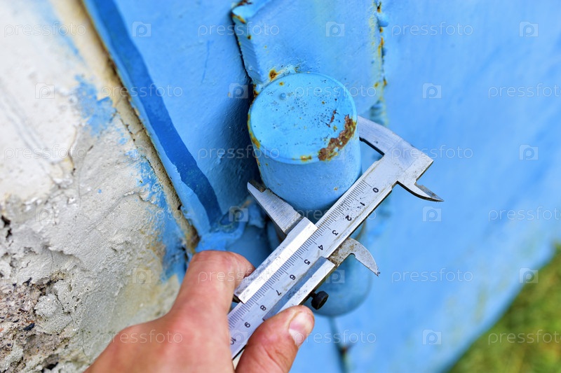 Измерение железных деталей штангенциркулем на синем фоне