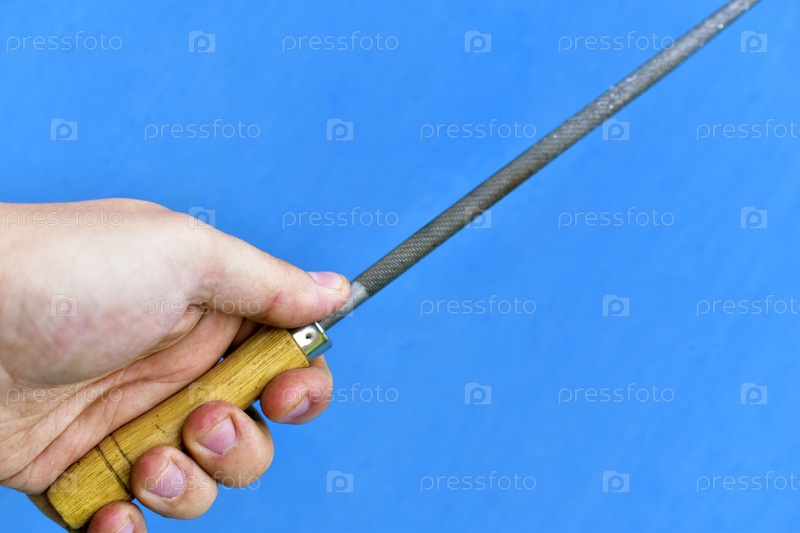 Железный круглый напильник с деревянной ручкой в руке на синем фоне