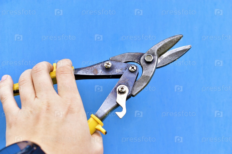 Строительные ножницы прямо по металлу в руке на синем фоне