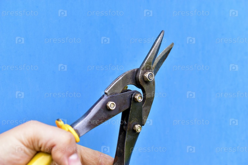 Строительные ножницы прямо по металлу в руке на синем фоне
