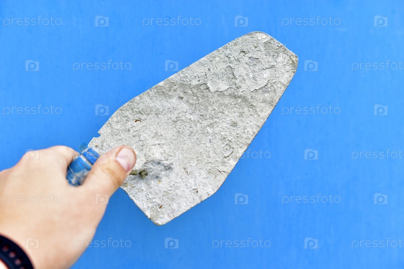 Железный шпатель с бетоном в руке на синем фоне