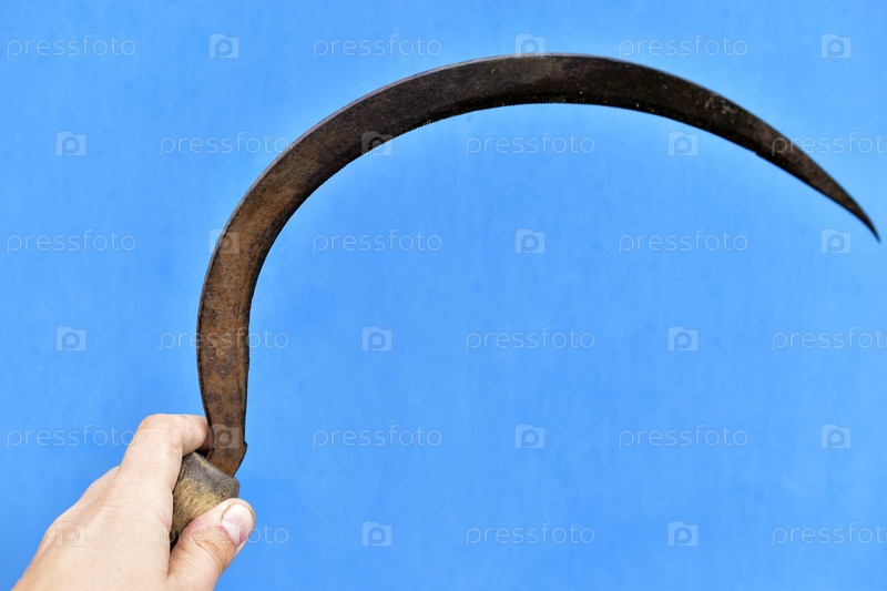 Железный серп в руке на синем фоне