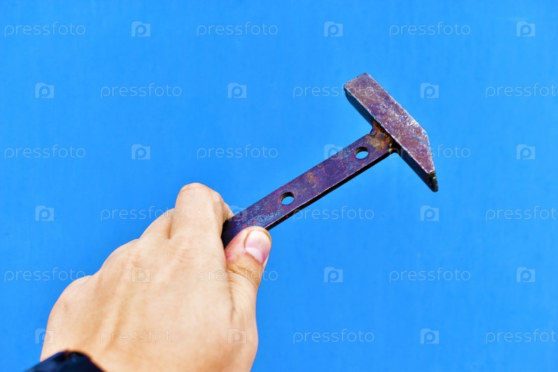 Маленький металлический молоток в руке на синем фоне