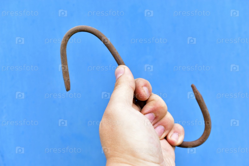 Железный ржавый крюк в руке на синем фоне