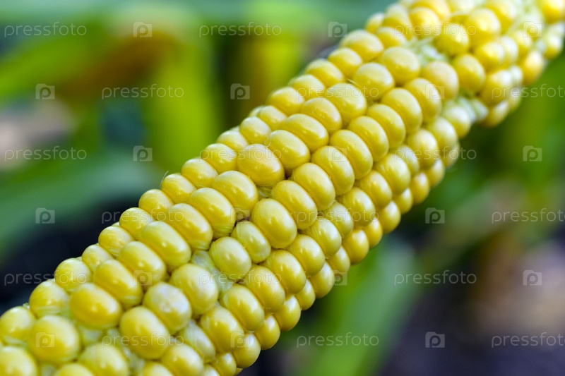 Спелый желтый кукурузный початок на фоне зелени в поле