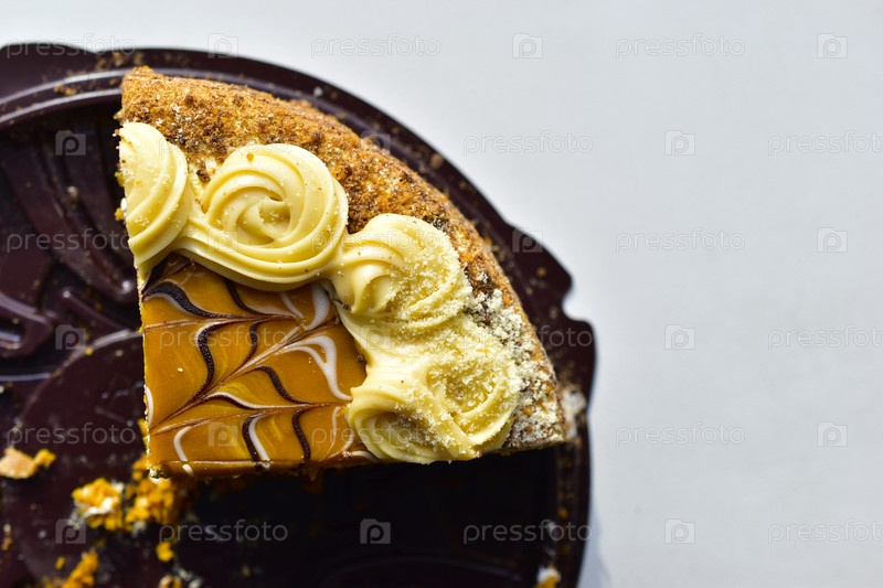 Кусок темного торта с медовым кремом крупным планом