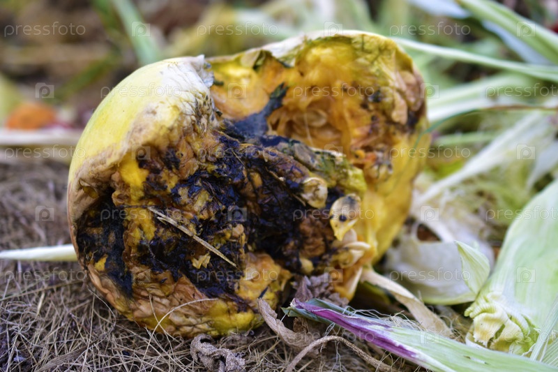 Тухлая желтая тыква на куче компоста