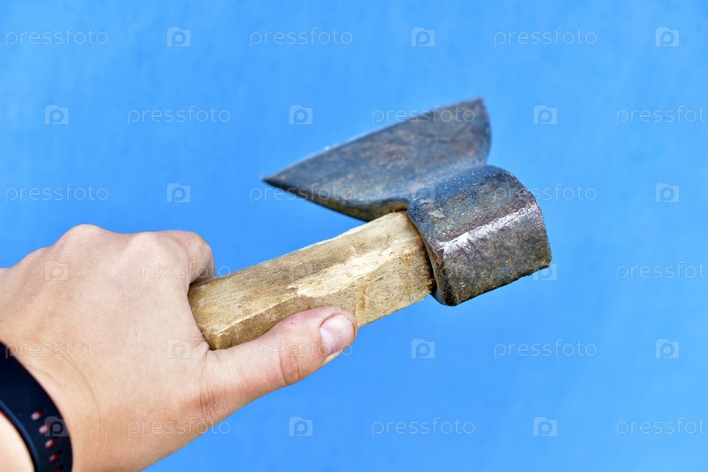 Железный топор с деревянной ручкой в руке на синем фоне