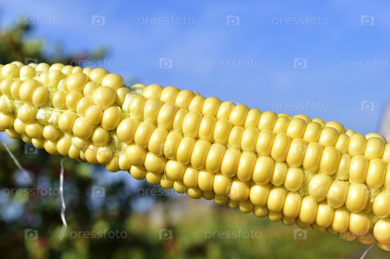 Спелый желтый кукурузный початок на фоне зелени в поле