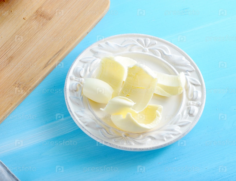 Масло на тарелке на синем деревянном фоне
