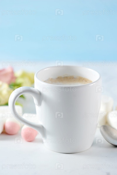 Капучино в белой кружке с цветами и зефиром