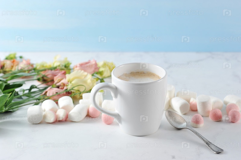 Капучино в белой кружке с цветами и зефиром