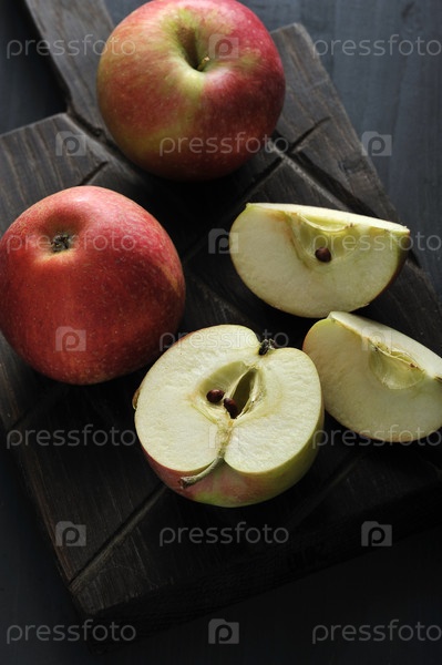 Красные спелые яблоки на деревянной доске