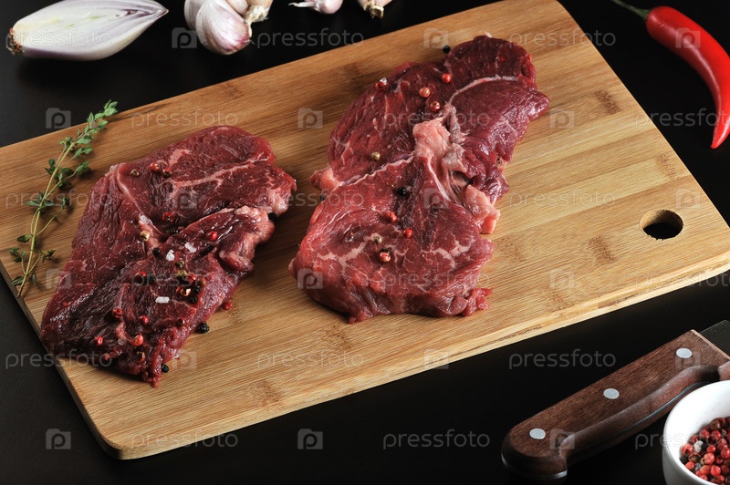 Два стейка из сырой говядины со специями, перцем