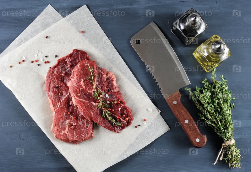 Два стейка из сырой говядины со специями, кухонный нож