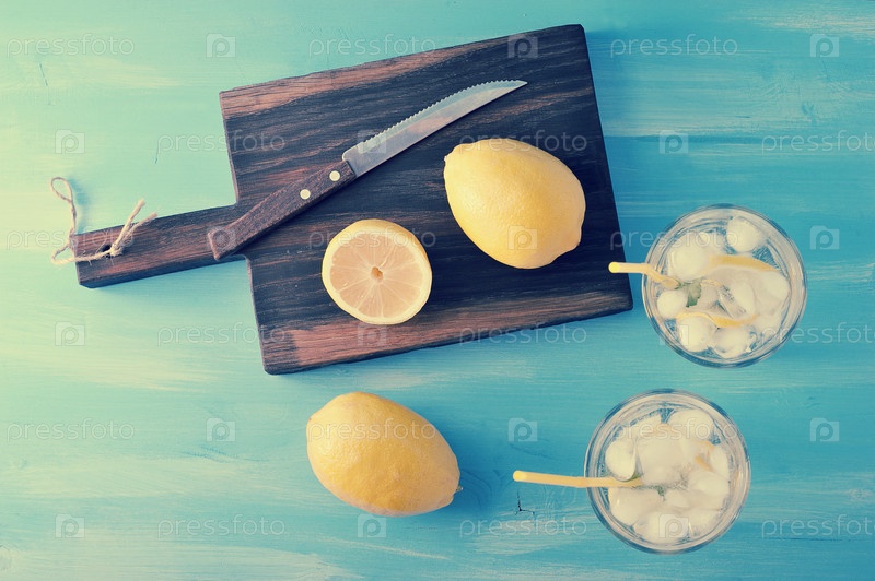 Домашний лимонад - лимон, мята, лед и вода в стаканах