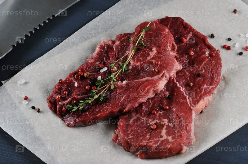Два красных сырых говяжьих стейка на бумаге со специями - вид сверху