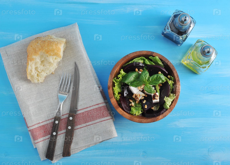 Салат со свеклой, фетой, кедровыми орешками в деревянной тарелке