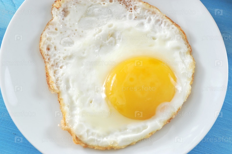 Жареное яйцо на тарелке на синем фоне