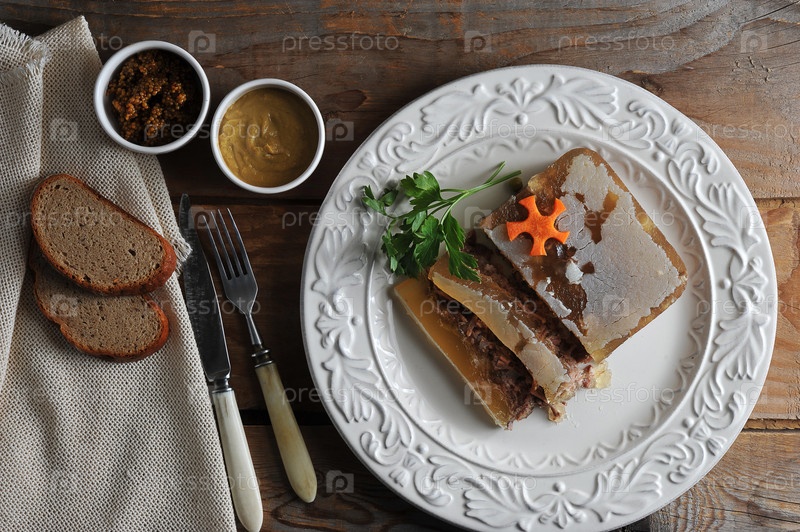Желе на тарелке и горчица с хлебом