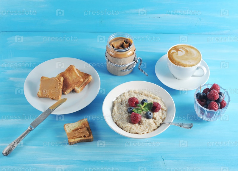 Овсянка на завтрак на синем фоне