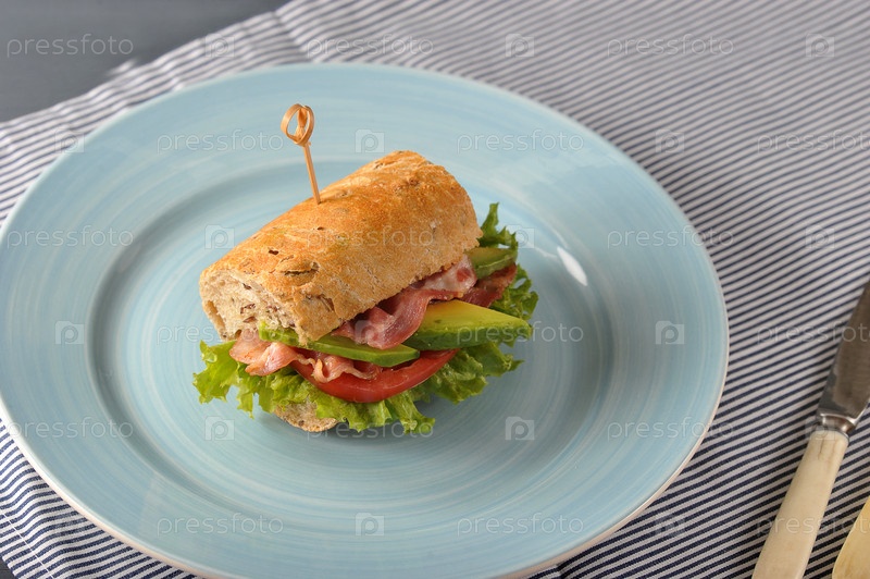 Бутерброд с беконом и авокадо, проткнутый шпажкой