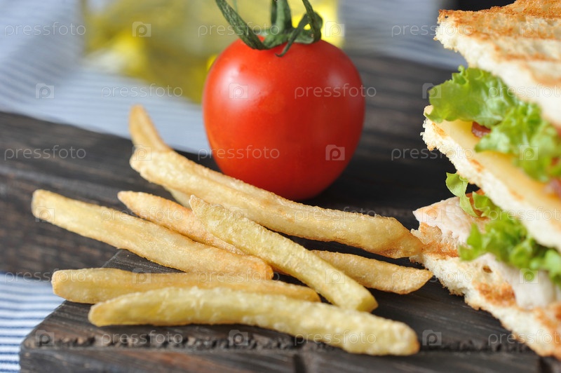 Жареный картофель фри и помидоры с бутербродом