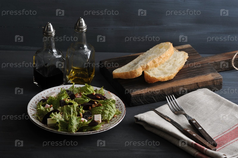 Салат со свеклой, листья салата, брынза, жареные кедровые орешки
