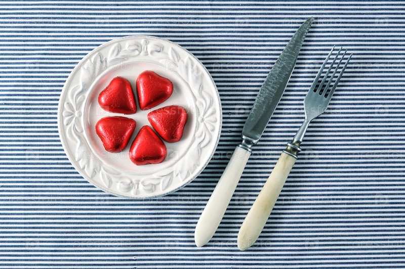 Красные сердечки на тарелке и нож с вилкой