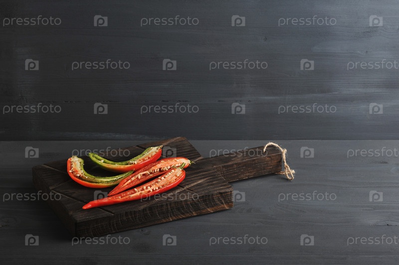 Красный и зеленый перец чили разрезать пополам на деревянной доске