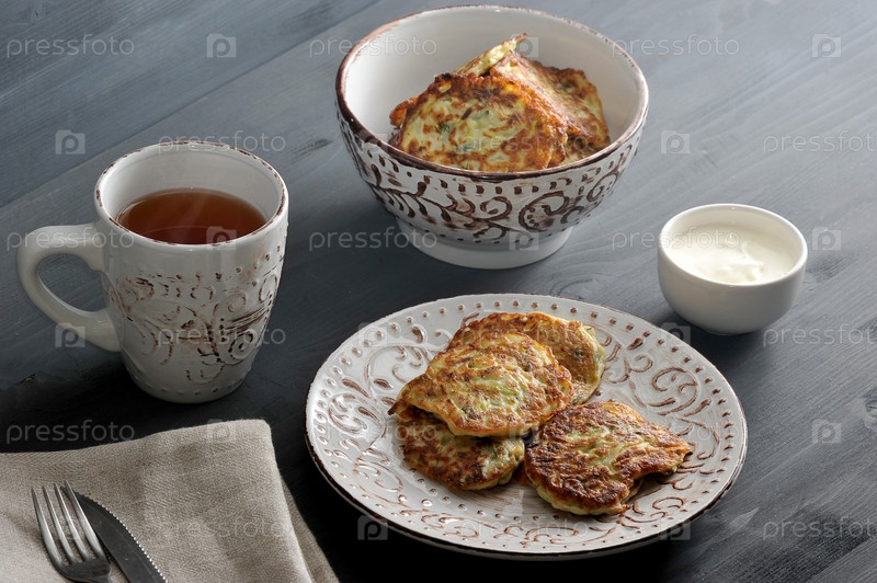 Оладьи из кабачков с укропом в глубокой посуде, чай, сметана