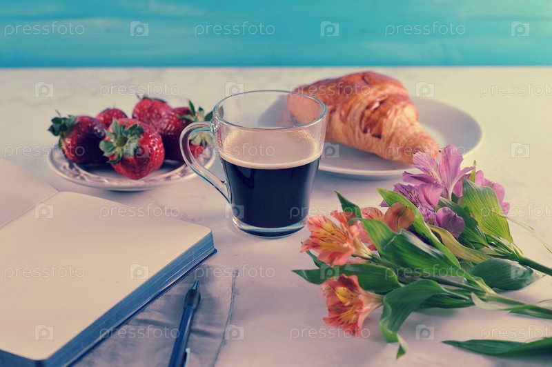 Утренний романтический завтрак - кофейный журнал, пустая тетрадь