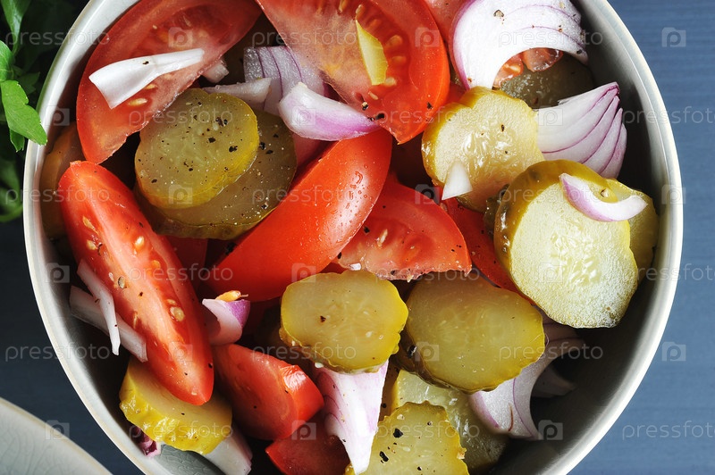 Салат-закуска с помидорами, солеными огурцами и луком