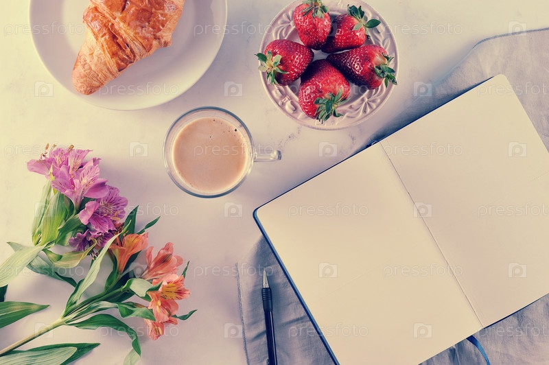 Утренний романтический завтрак - кофейный журнал, пустая тетрадь