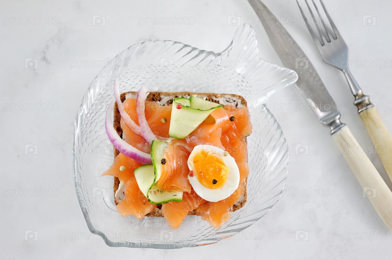 Бутерброд с лососем, огурцом, яйцом и луком