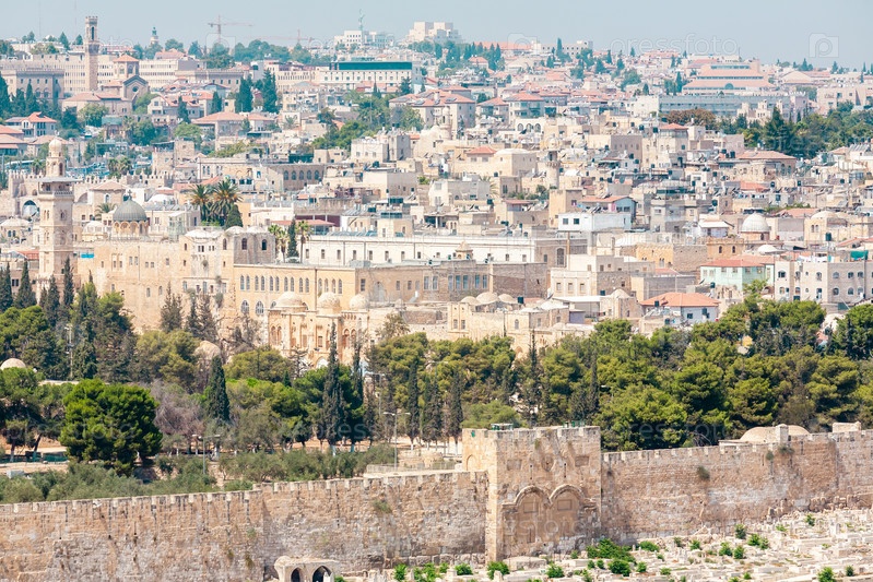 Вид на старый город Иерусалима и старую стену с Елеонской горы, Израиль