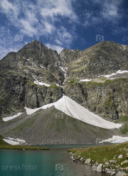 Вид на озеро Имерети и горы. Голубое озеро в окружении гор и ледников