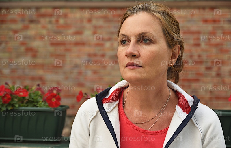 Взрослая привлекательная женщина в повседневной одежде сидит на улице на фоне кирпичной стены