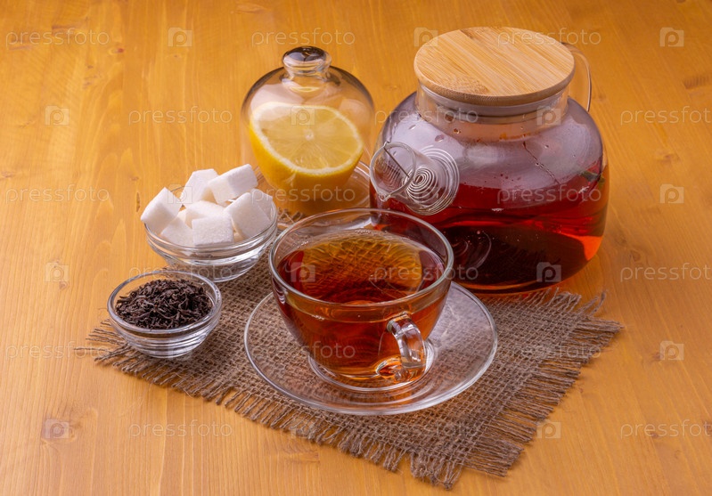 Чайник и стеклянная чашка с заваривающимся черным чаем. Рядом разрезанный лимон и кусковой сахар. Красивый яркий деревянный фон